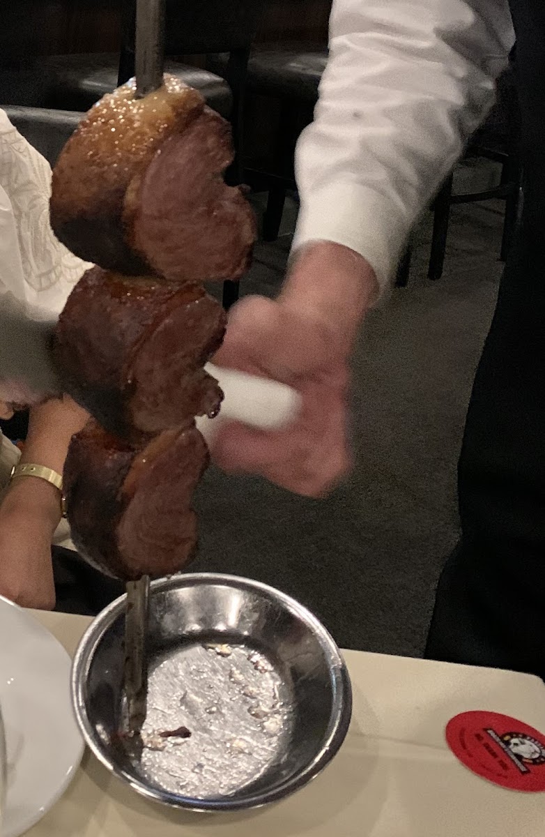 My hubby and I went with 2 other couples to celebrate a 50th birthday on a Sunday evening. It was my first time dinning here. Everything was great from the service to the bread, to the salad bar to the meats. The salad bar featured smokes salmon, asparagus, ceaser salad, black beans, rice, various pastas, and a bunch of other stuff The manager was very kind and even offered us to taste a Brazilian soda pop that was delicious! I never would have tired it had he not offered. We all ate until we were overly stuffed to say the least. As long as we were on green, the meat kept coming The meats that were offered was lamb chops and lamb legs(i think), pork ribs, beef ribs (which were my favorite because the meat was falling off the bones), chicken wrapped in bacon, ribeye, top sirlon steak,shrimp to name a few. It was an awesome experience and we look forward to attending again soon! I was too overwhelmed eating to take pictures of the servers of the meat